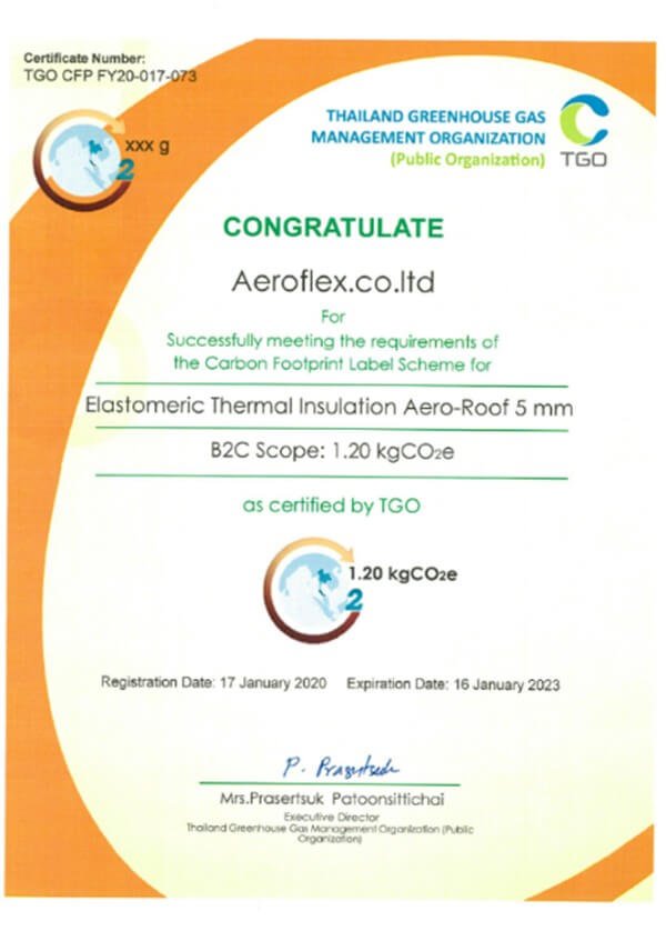 3. Certificate on Carbon Footprint for Product (CFP) in 2019 has also been granted by Thailand Greenhouse Gas Management Organization (TGO) to recognize the continuity for reporting the greenhouse gas emissions made by Aero-Roof under roof thermal insulation. We report our data on greenhouse gas emission level while delivering the optional choice for customers whose primary concern is on green products and service.
