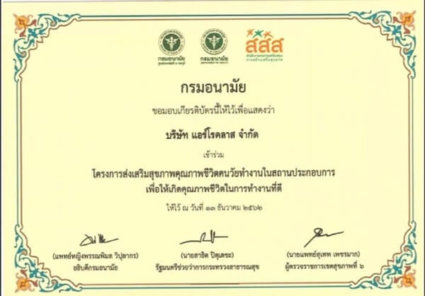 certificate on participating in the health promotion in workplace for enhancing the work's life quality, held by the Ministry of Industry